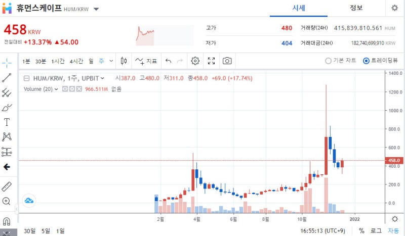 12월 18일 기준 [가상화폐] 휴먼스케이프의 시가총액은 3249.8억 원, 현재 유통량은 711,409,623주이다. 11월 18일 최고가인 1,275원 고점을 찍었는데 12월 14일 311원의 저점을 보여주고 조금씩 상승 18일 16시 55분 현재 코인 시세는 458원이다.